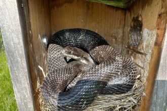 A shocked man found a huge snake inside his bird nesting box.…